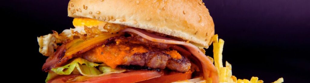 (Hamburguesa de cerdo, bacon, huevo, jamón, queso, lechuga, tomate, cebolla y salsa tejana)
