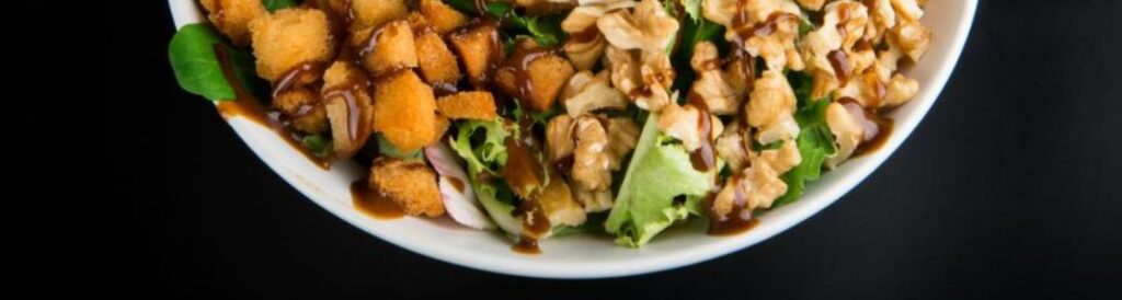 (Lechuga, nueces, pasas, queso feta, cebolla crujiente, picatostes y vinagreta de miel-mostaza)